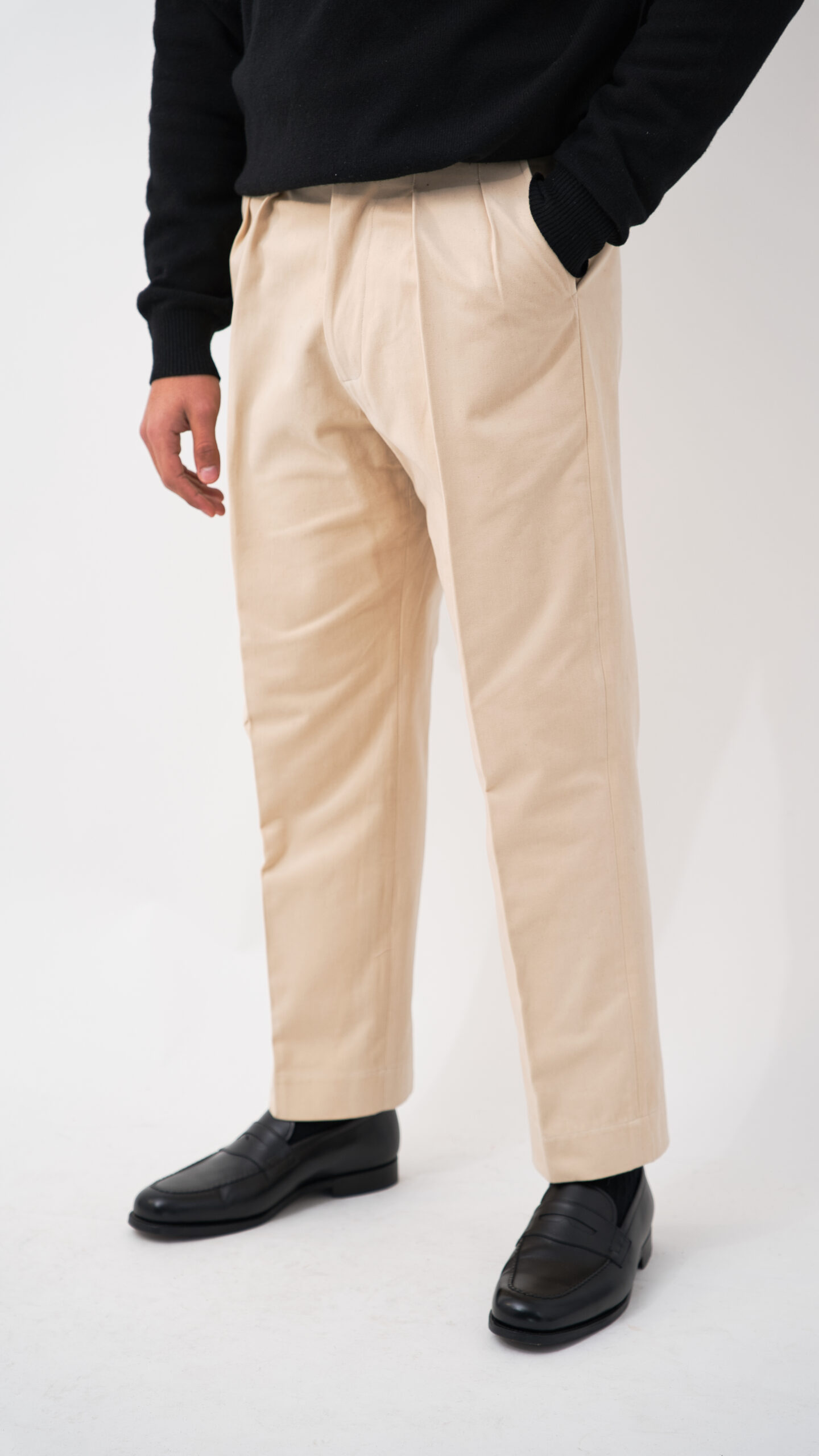 Sa construction met l’accent sur un volume généreux au niveau des cuisses, inspiré du vestiaire tailleur traditionnel, tout en conservant une ligne nette et équilibrée sur l’ensemble de la jambe.